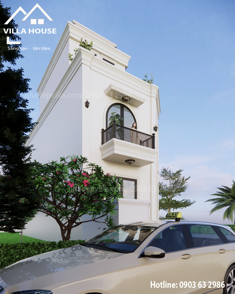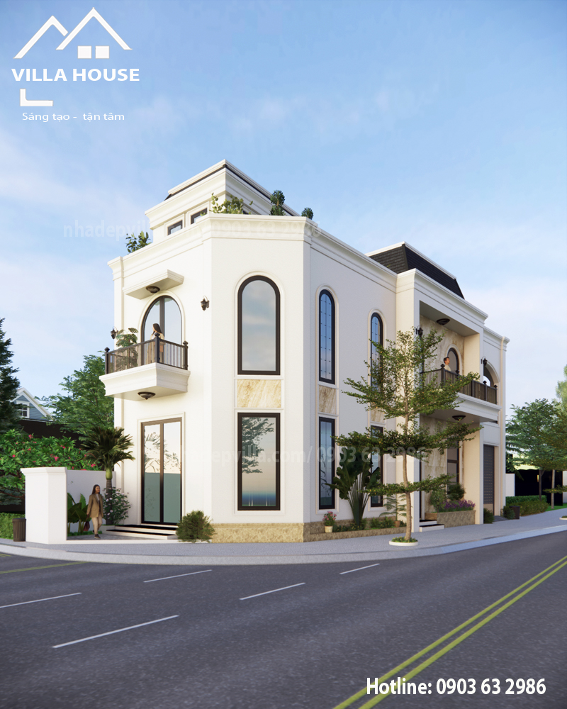 Hệ cửa vòm mềm mại, lan can sắt mỹ thuật tinh tế cùng chóp mái (chuồng cu) phía trên góp phần hoàn thiện diện mạo kiến trúc, tạo nên một tổng thể hài hòa giữa cổ điển và hiện đại. Đặc biệt, thiết kế được xử lý đồng bộ trên cả hai mặt tiền, giúp công trình luôn đẹp ở mọi góc nhìn – điều không dễ đạt được với những lô đất góc phố.