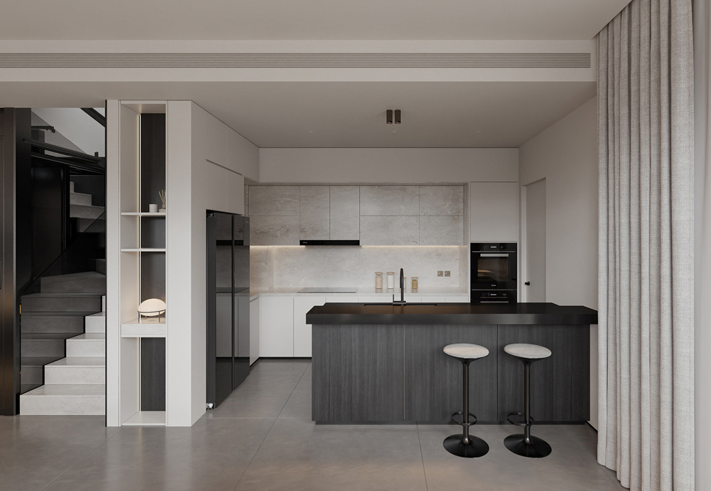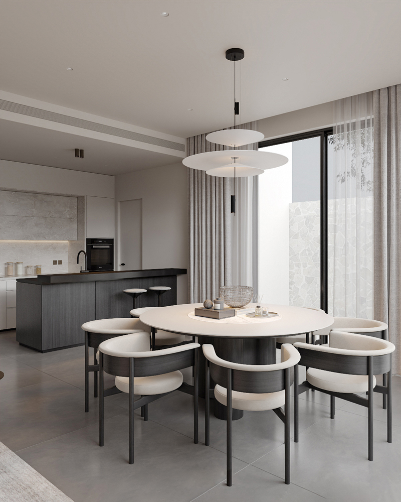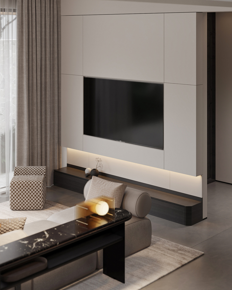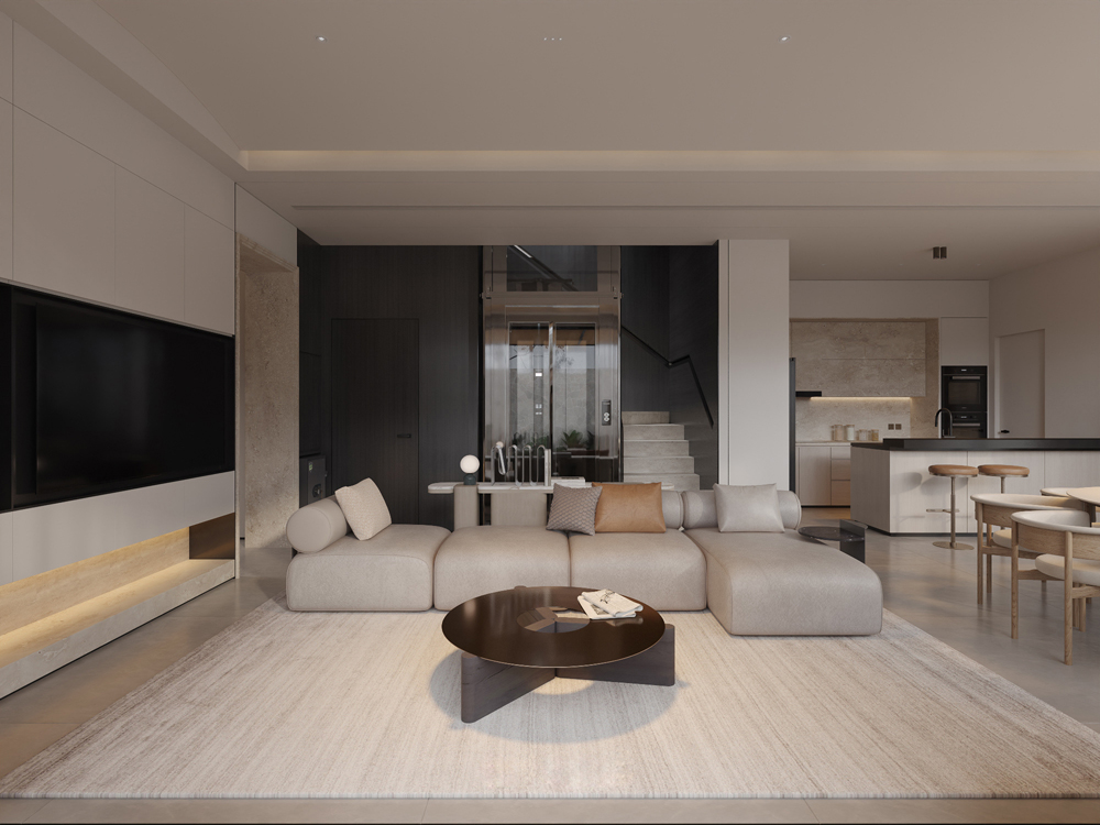 Bên trong, không gian nội thất được thiết kế theo định hướng tân cổ điển hiện đại, chú trọng vào sự thoải mái và công năng sử dụng lâu dài. Các khu vực phòng khách, bếp – ăn và phòng ngủ được liên kết mạch lạc, sử dụng gam màu trung tính kết hợp vật liệu cao cấp, tạo nên tổng thể ấm cúng nhưng vẫn giữ được nét sang trọng.