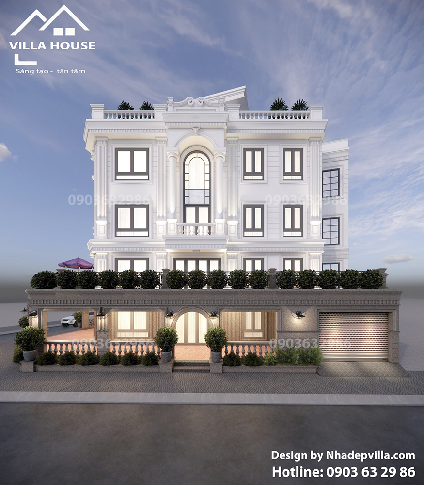 Mặt tiền biệt thự được thiết kế theo ngôn ngữ tân cổ điển châu Âu, với: